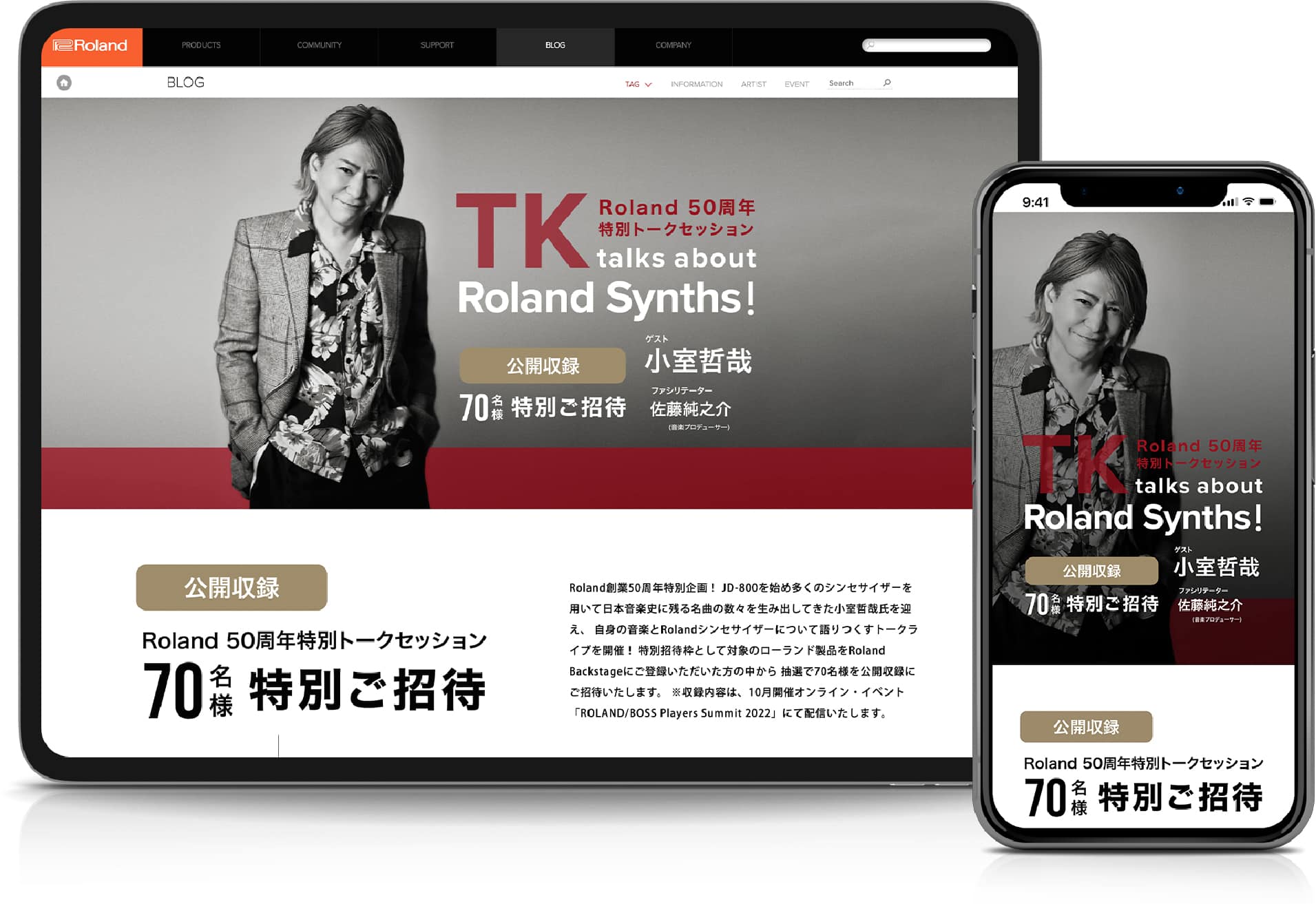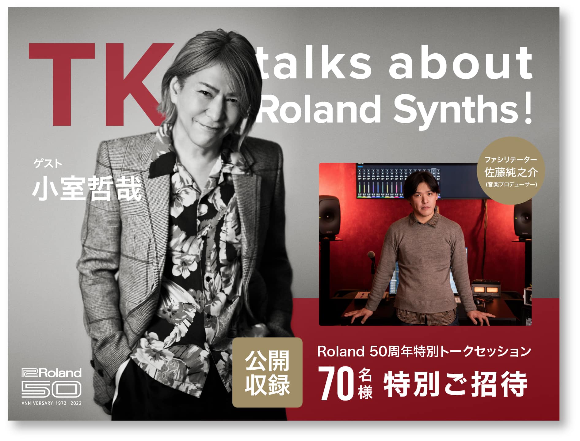 Roland創業50周年特別企画 JD-800を始め多くのシンセサイザーを用いて日本音楽史に残る名曲の数々を生み出してきた小室哲哉氏。自身の音楽とRolandシンセサイザーについて語りつくすトークライブを開催。ランディングページ、メインビジュアル制作を担当いたしました。